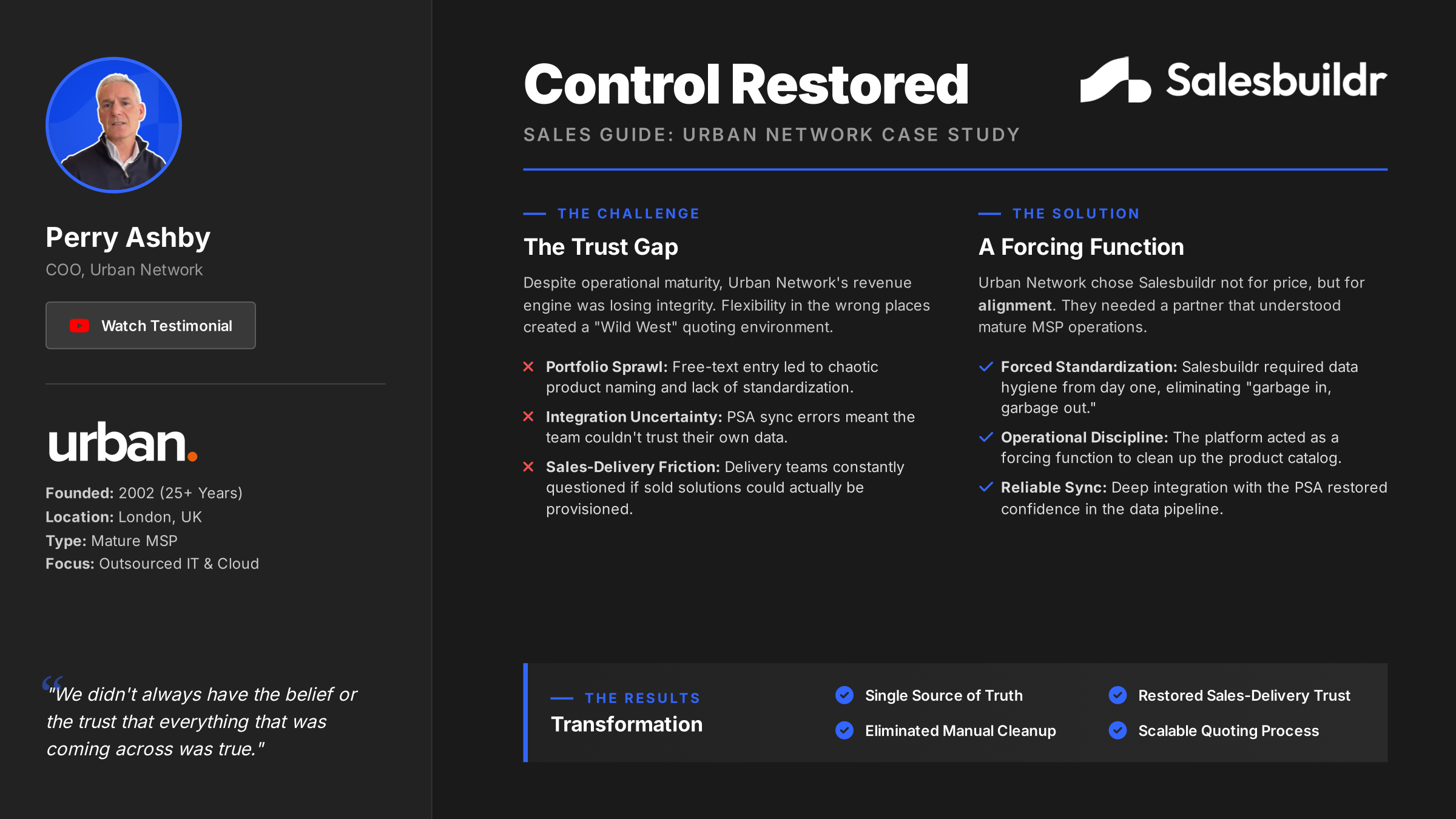“You've got to appreciate that's your revenue engine. To move that somewhere else, it's a huge, huge decision. It takes confidence in the tool you're moving to.”Perry Ashby, CEO, Urban Network