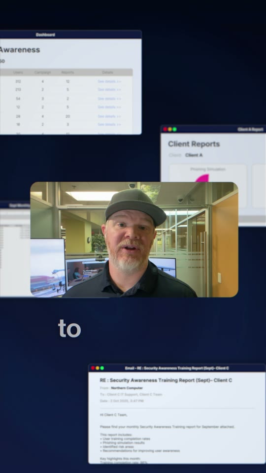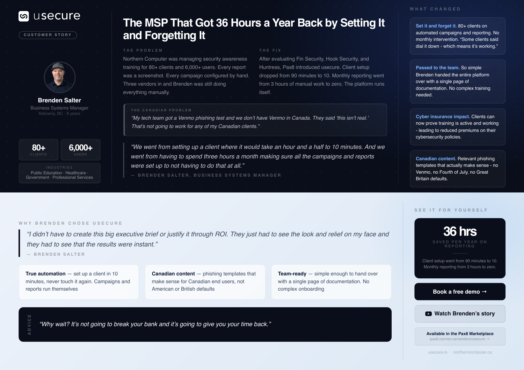 A single 45-minute remote interview turns into a full content system. Click any tile to see every page, every reel, every quote card spread out in full. Real assets from a real customer — Brenden Salter at Northern Computer (a usecure customer).